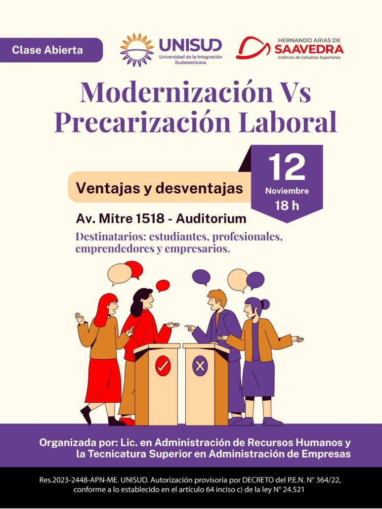 El próximo miércoles 12 de noviembre, a las 18 h, se realizará en el Auditorio del Instituto de Estudios Superiores Hernando Arias de Saavedra (Av. Mitre 1518, Posadas) la clase abierta “Modernización vs. Precarización laboral: ventajas y desventajas”, una actividad conjunta entre el Instituto de Estudios Superiores Hernando Arias de Saavedra y la Universidad de la Integración Sudamericana (UNISUD).
