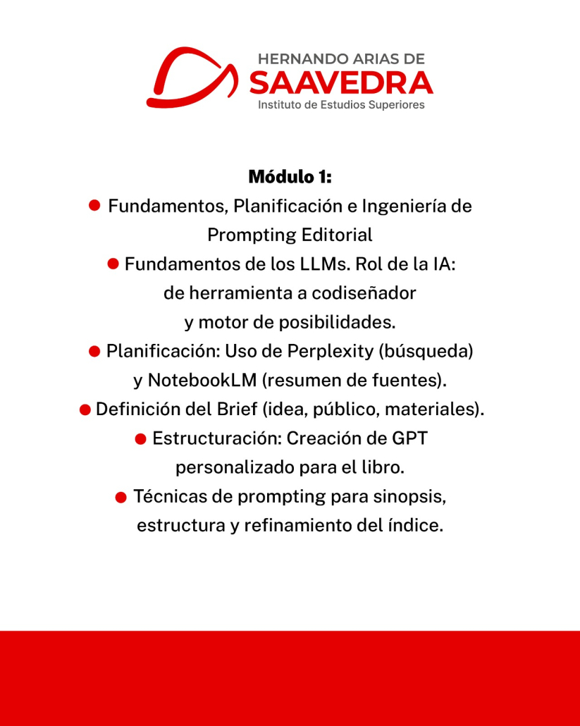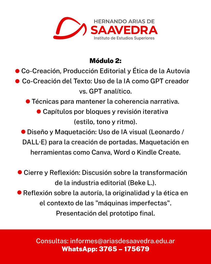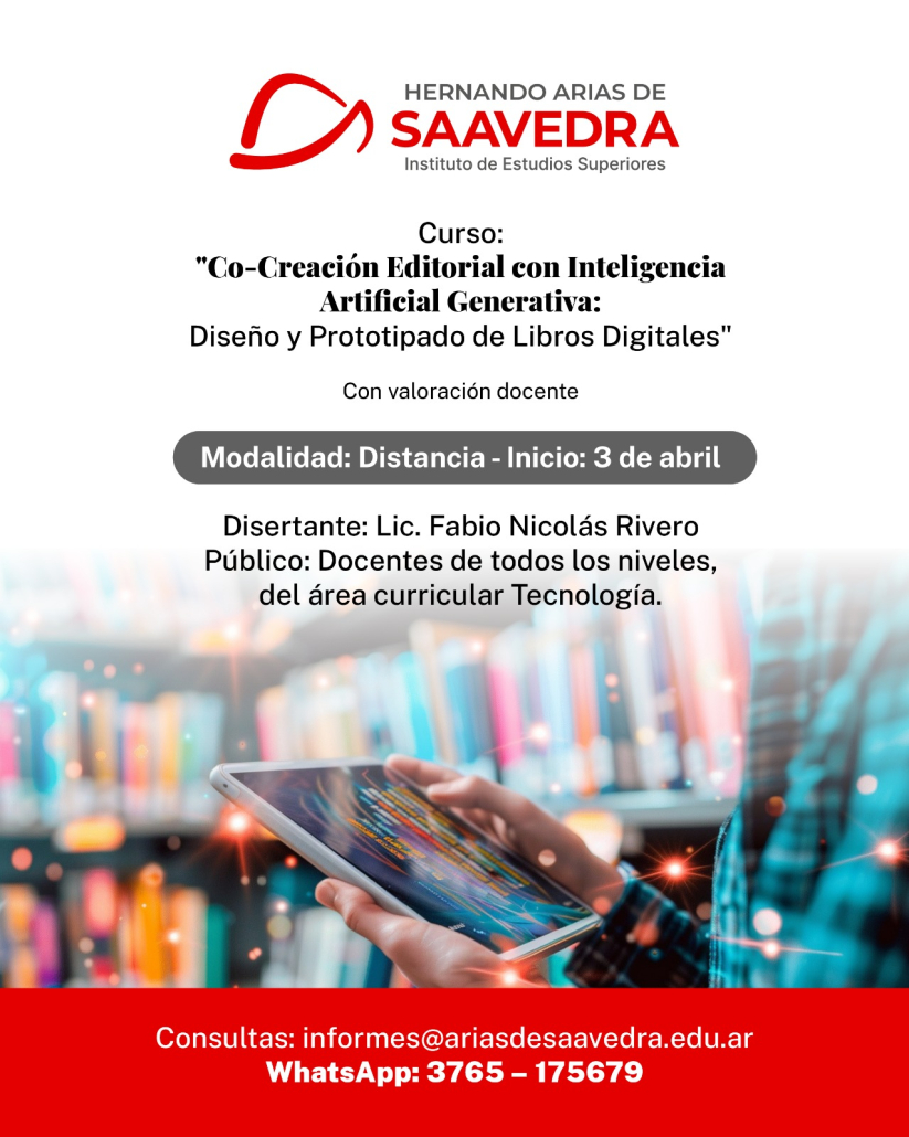 El Instituto de Estudios Superiores “Hernando Arias de Saavedra” abrió la inscripción al curso “Co-Creación Editorial con Inteligencia Artificial Generativa: Diseño y Prototipado de Libros Digitales”, una propuesta de formación innovadora destinada a docentes de todos los niveles del sistema educativo del área de Tecnología.
